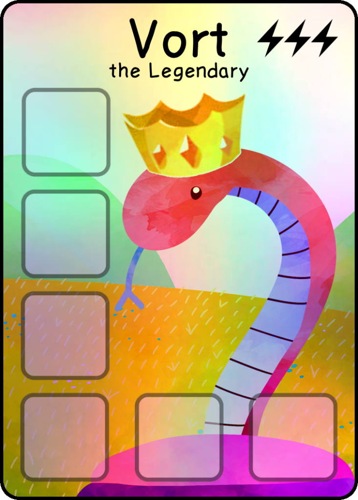 - If Vort, the Legendary ends up being the last card in play (because he is often so hard to acquire for players during the match), turn his card sideways to indicate that he has morphed into the 30-point card FEED-ME-EVERYTHING Vort. In this form he becomes much easier to feed: The player who feeds him one of every fruit wins—winning the tournament and the Legendary 6-Fruit Vort!